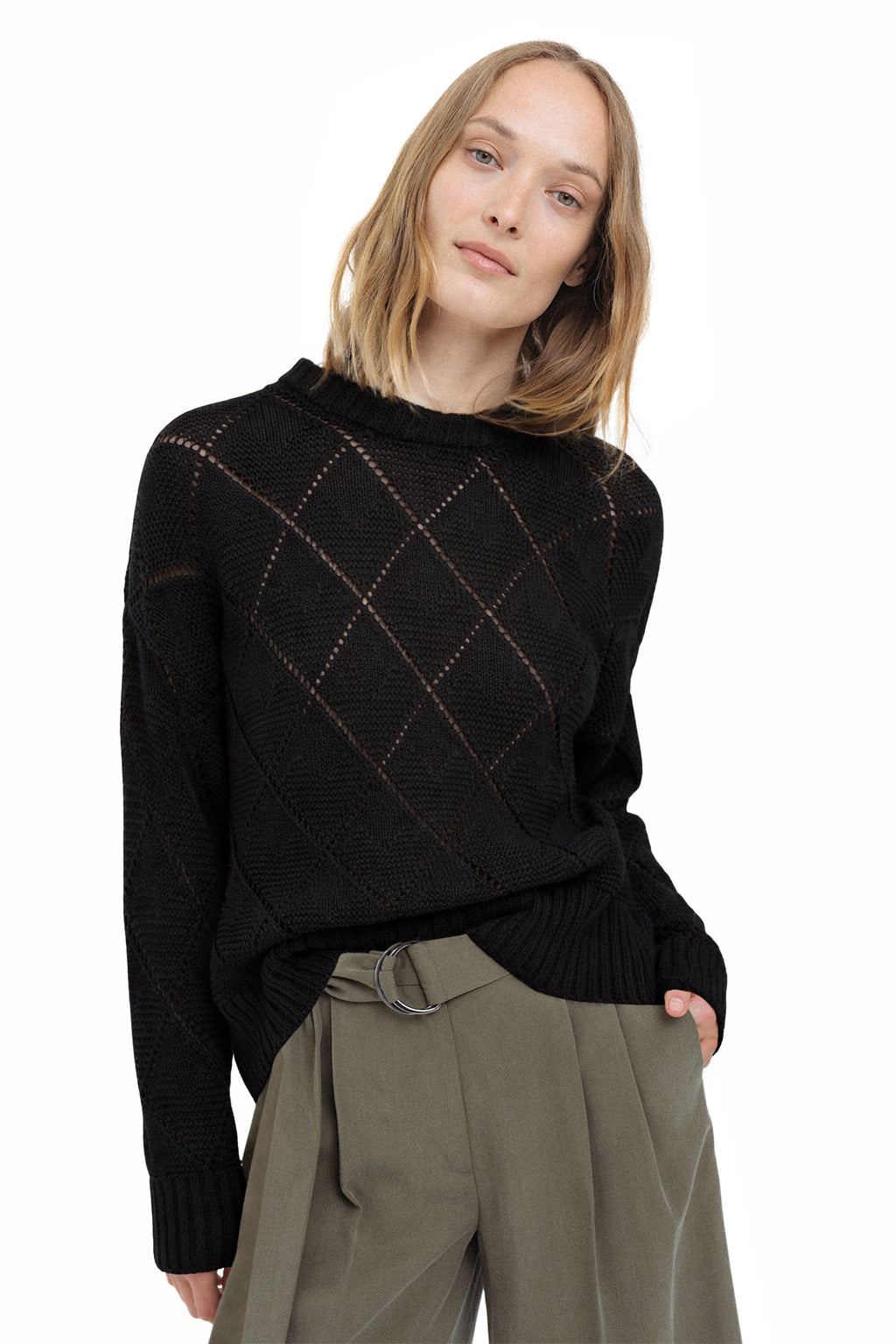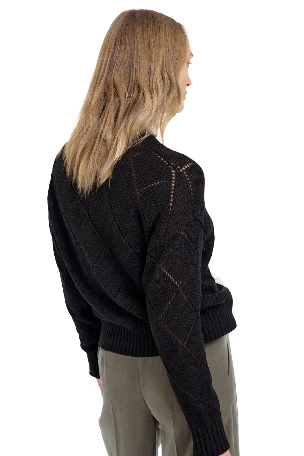 BLACK OPEN-KNIT SWEATER WITH DIAMOND PATTERN