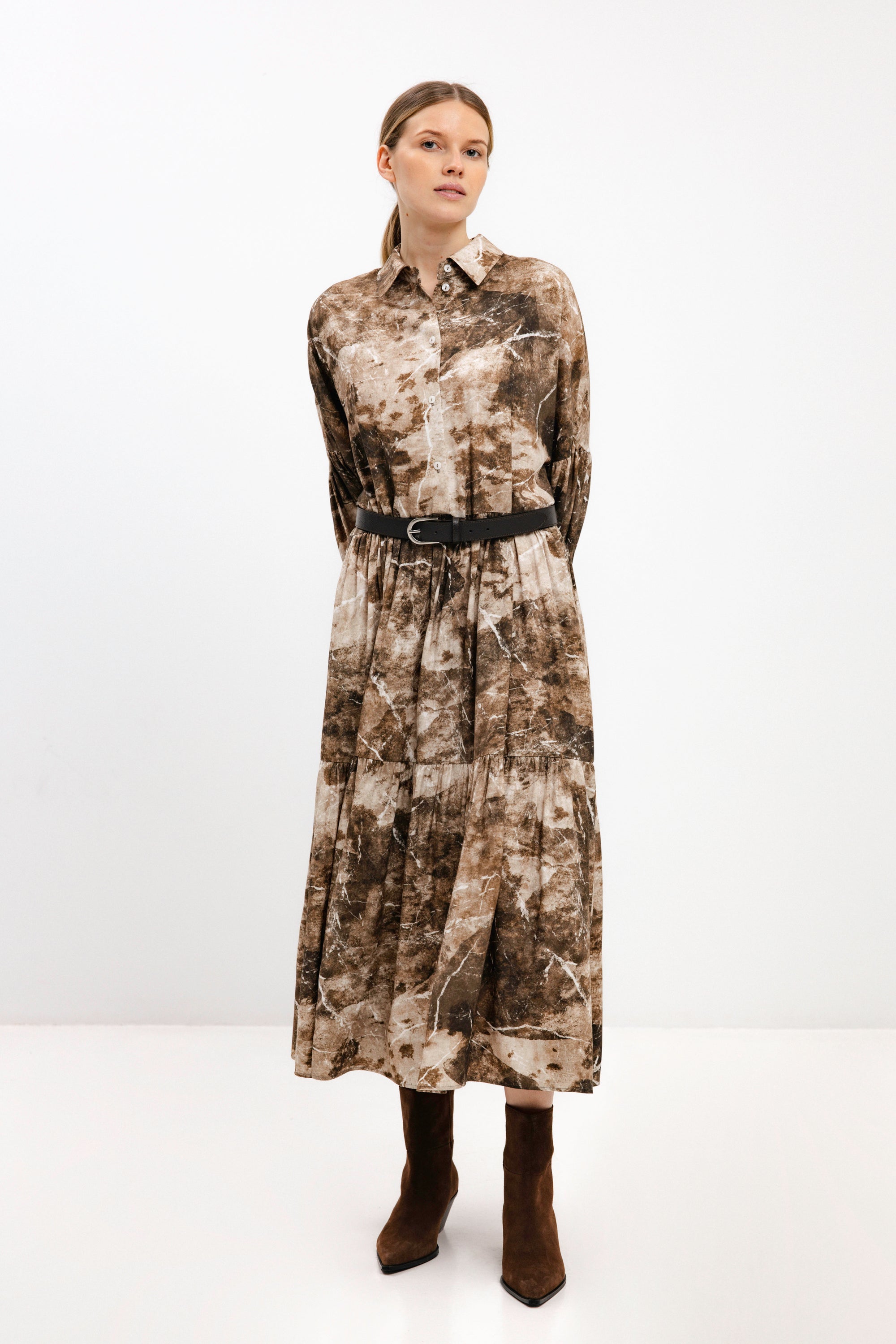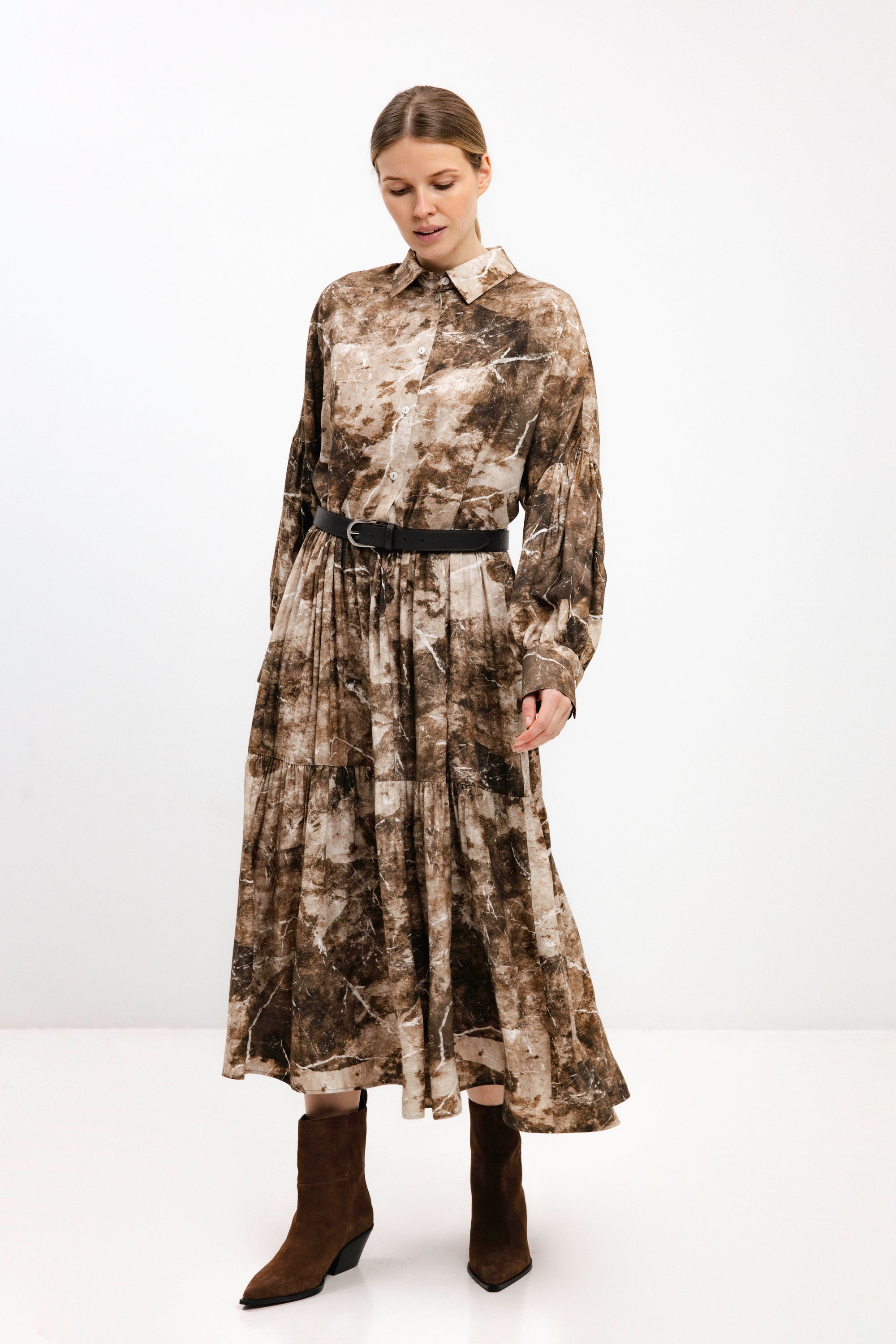 TIERED SHIRT DRESS WITH ABSTRACT PRINT