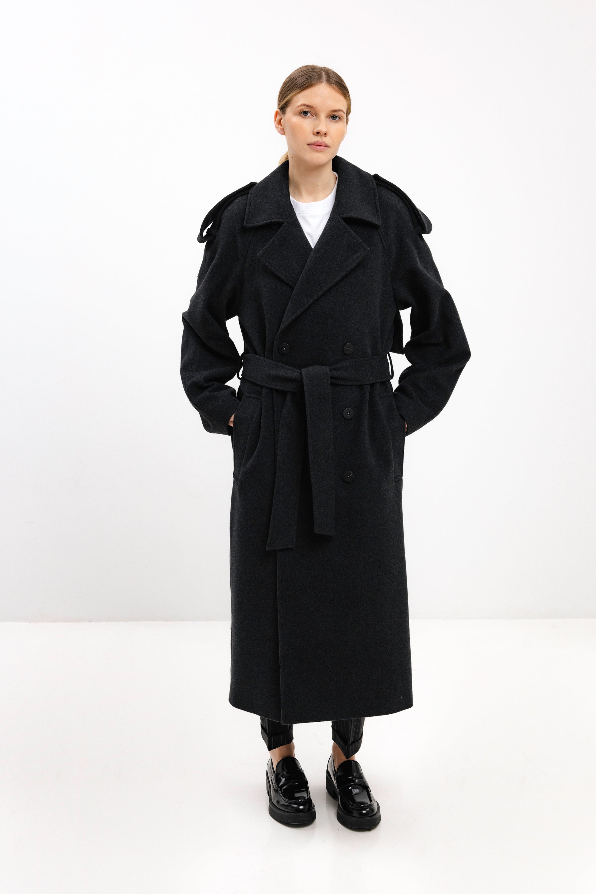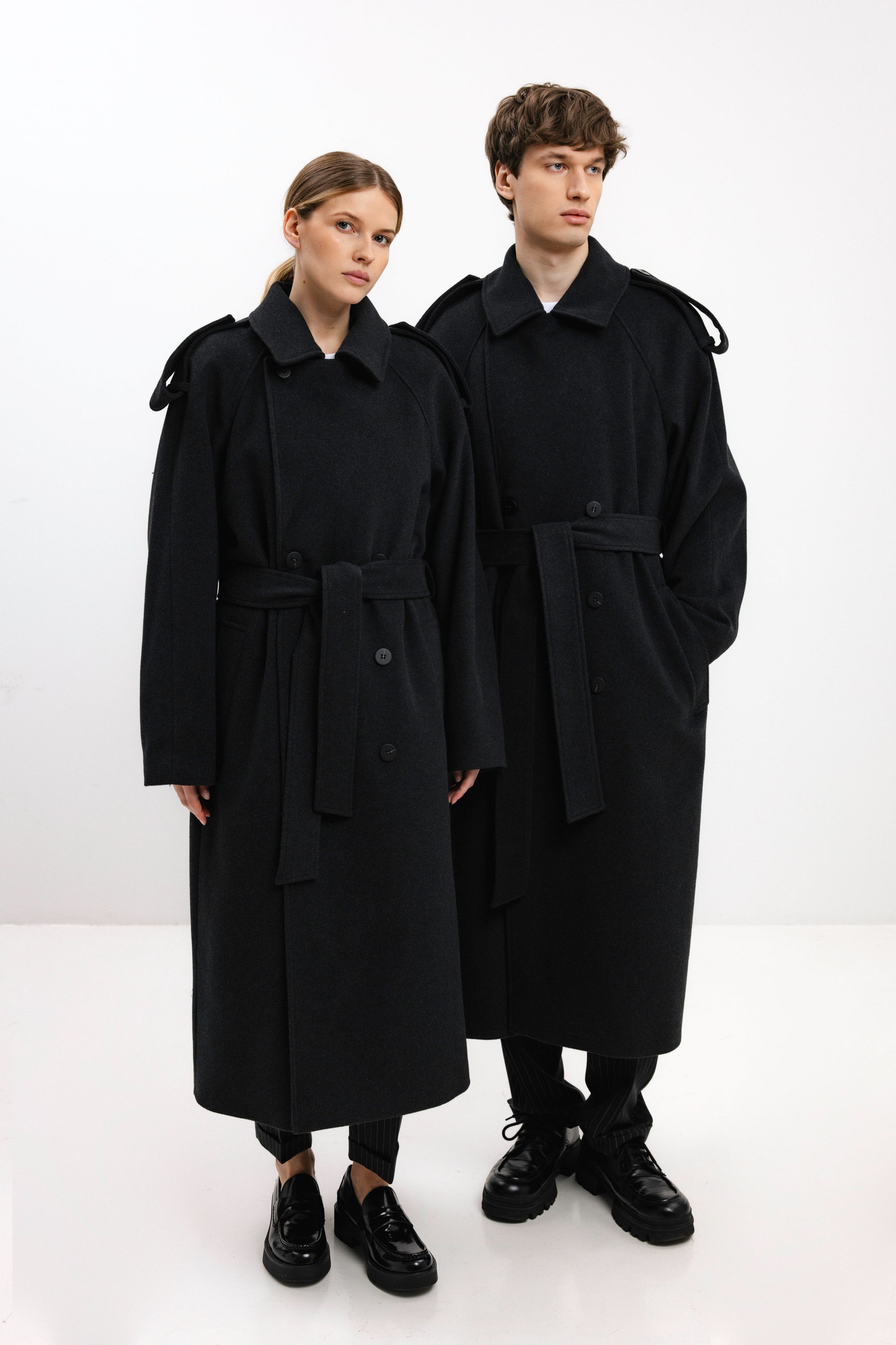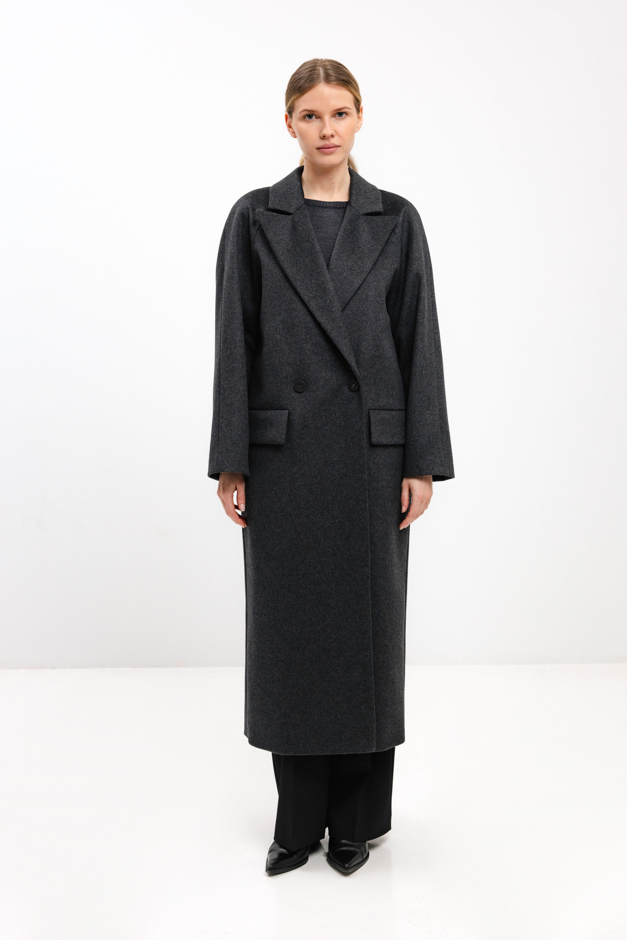 UNISEX LONG ANTHRACITE DOUBLE-BREASTED WOOL COAT