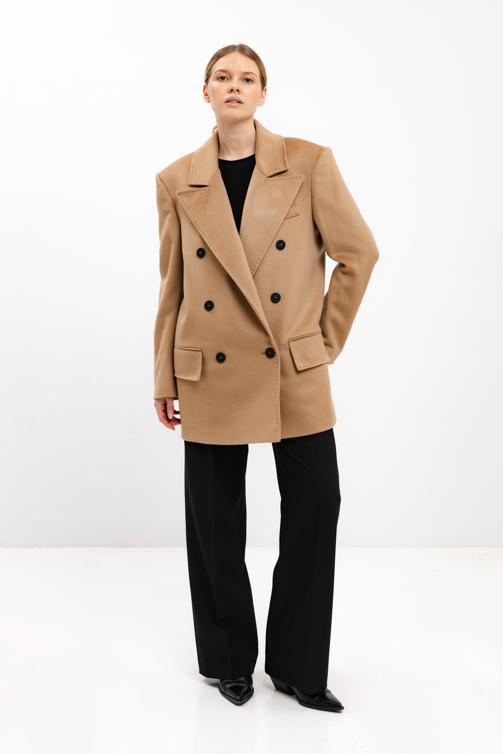 DOUBLE-BREASTED SHORT WOOL COAT IN CAMEL