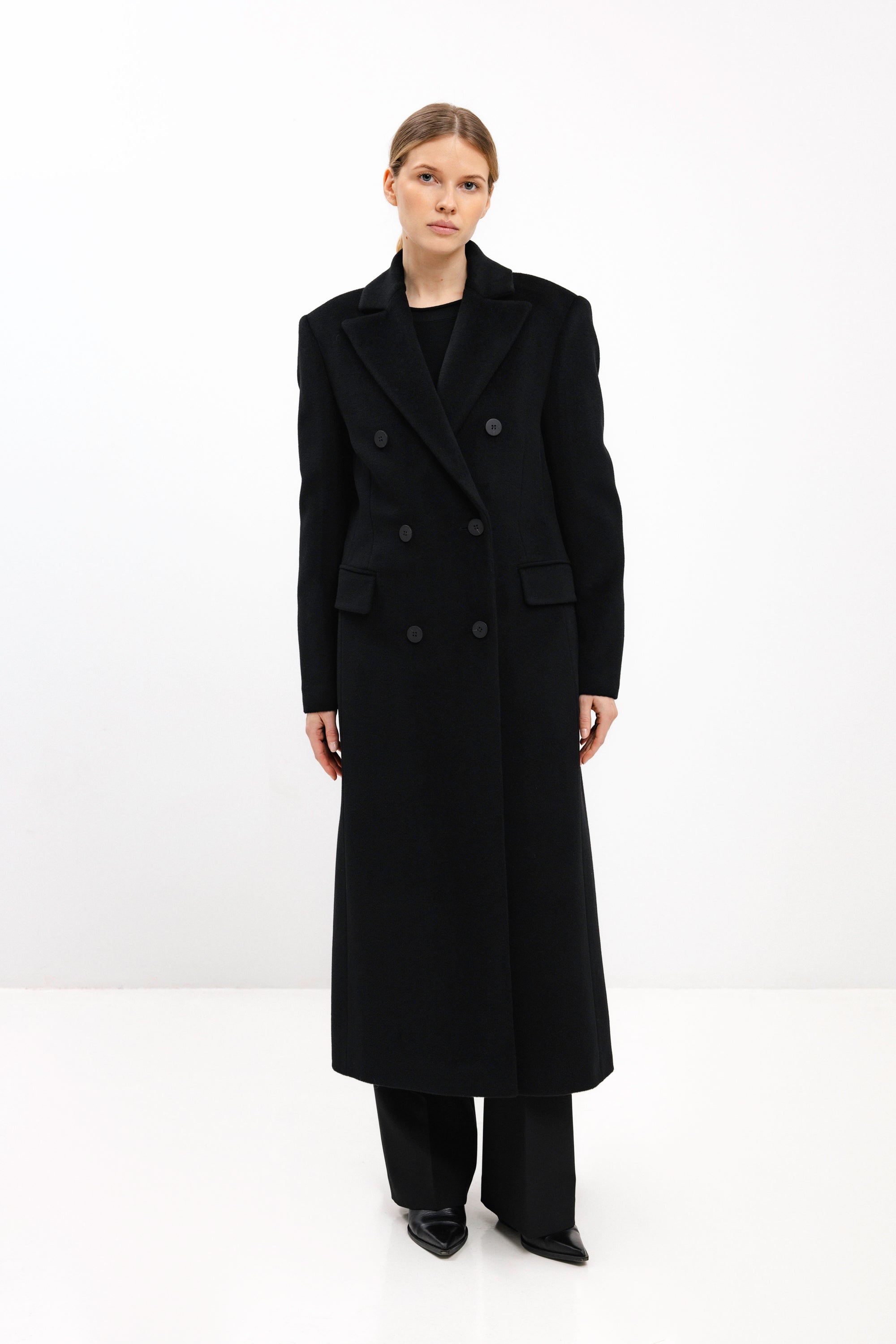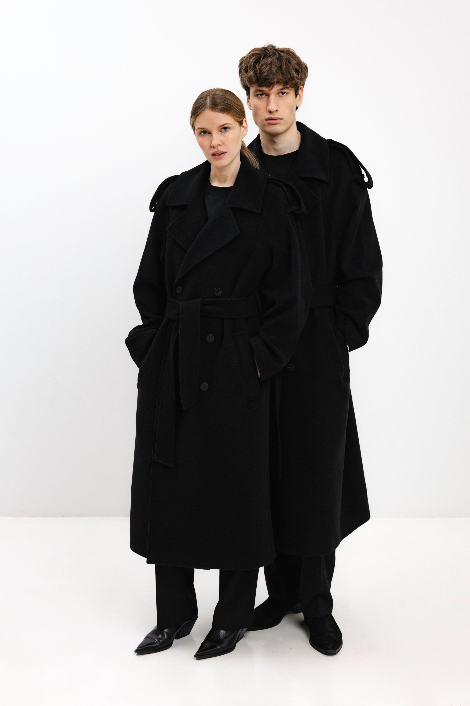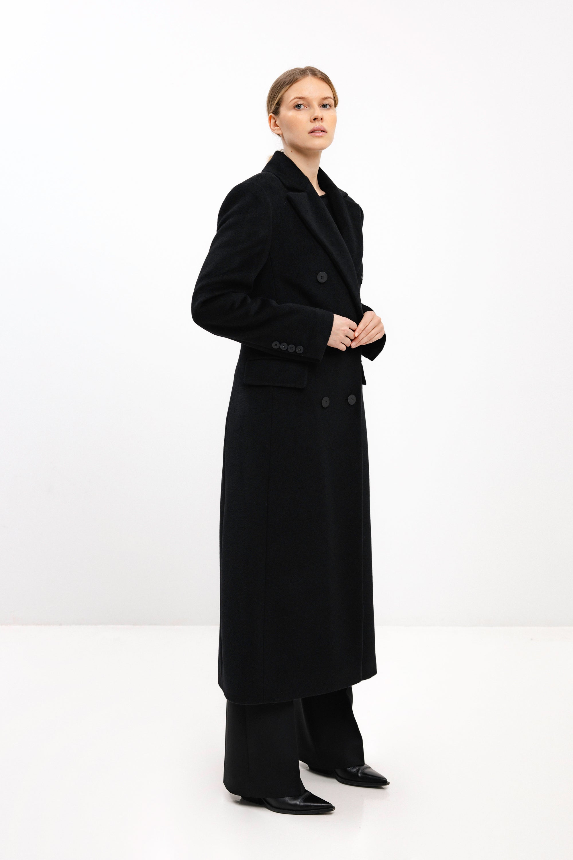 UNISEX LONG BLACK DOUBLE-BREASTED WOOL COAT