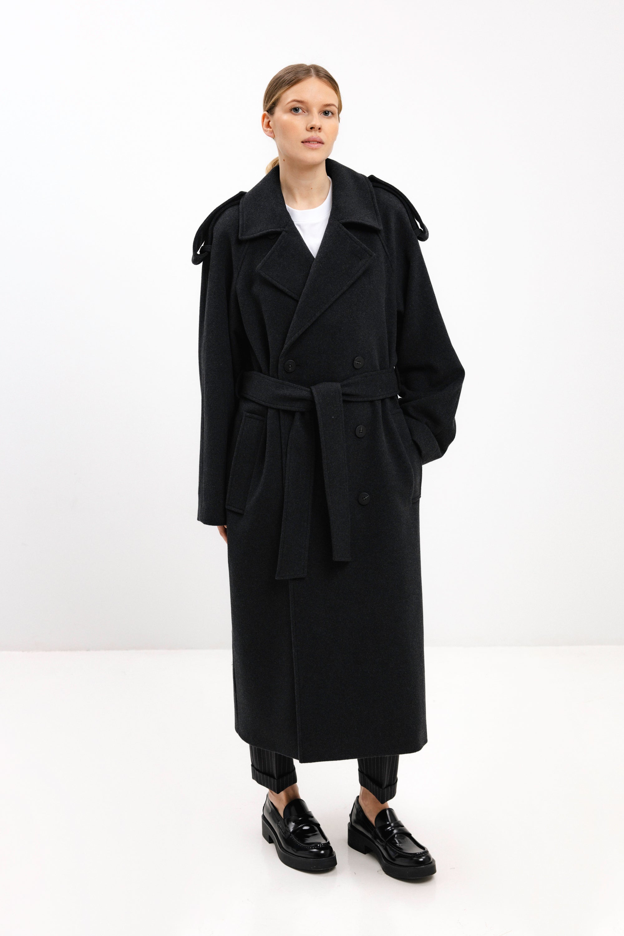 LONG DARK GREY WOOL COAT WITH RAGLAN SLEEVES