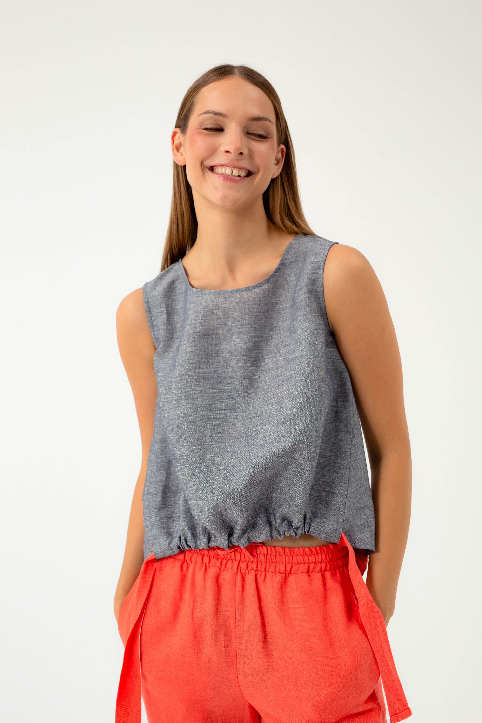 SLEEVELESS NAVY MELANGE BLOUSE WITH LINEN