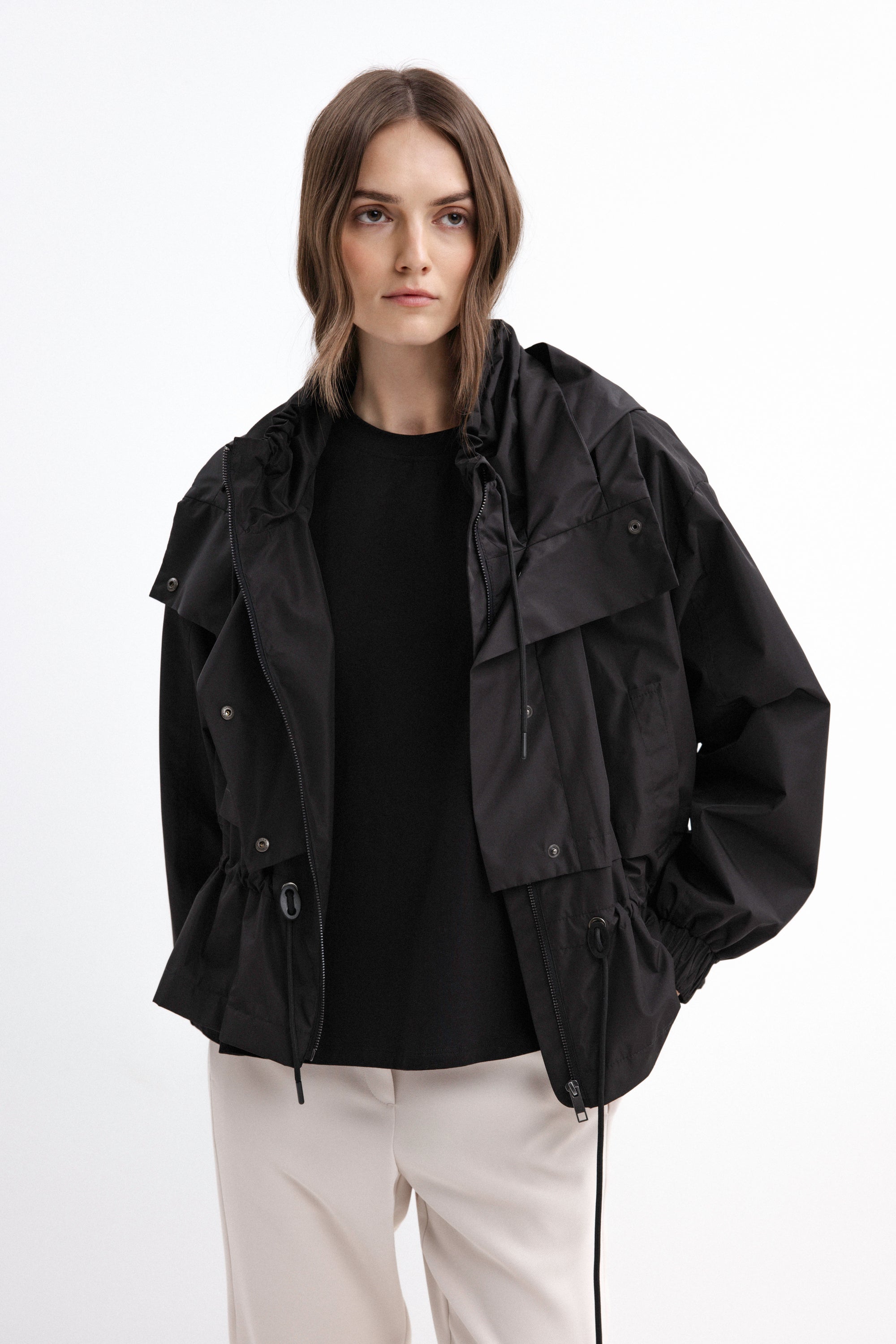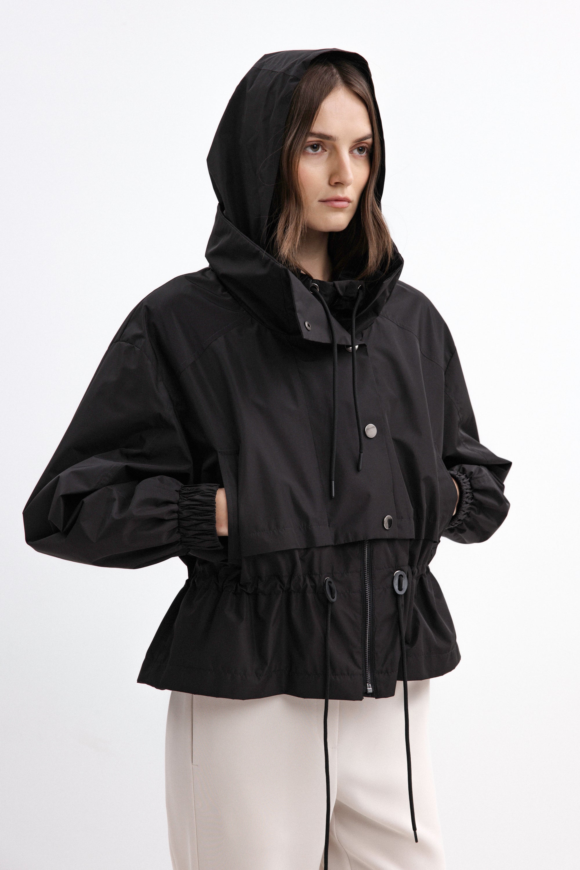 BLACK SHORT RAINCOAT WITH HOOD