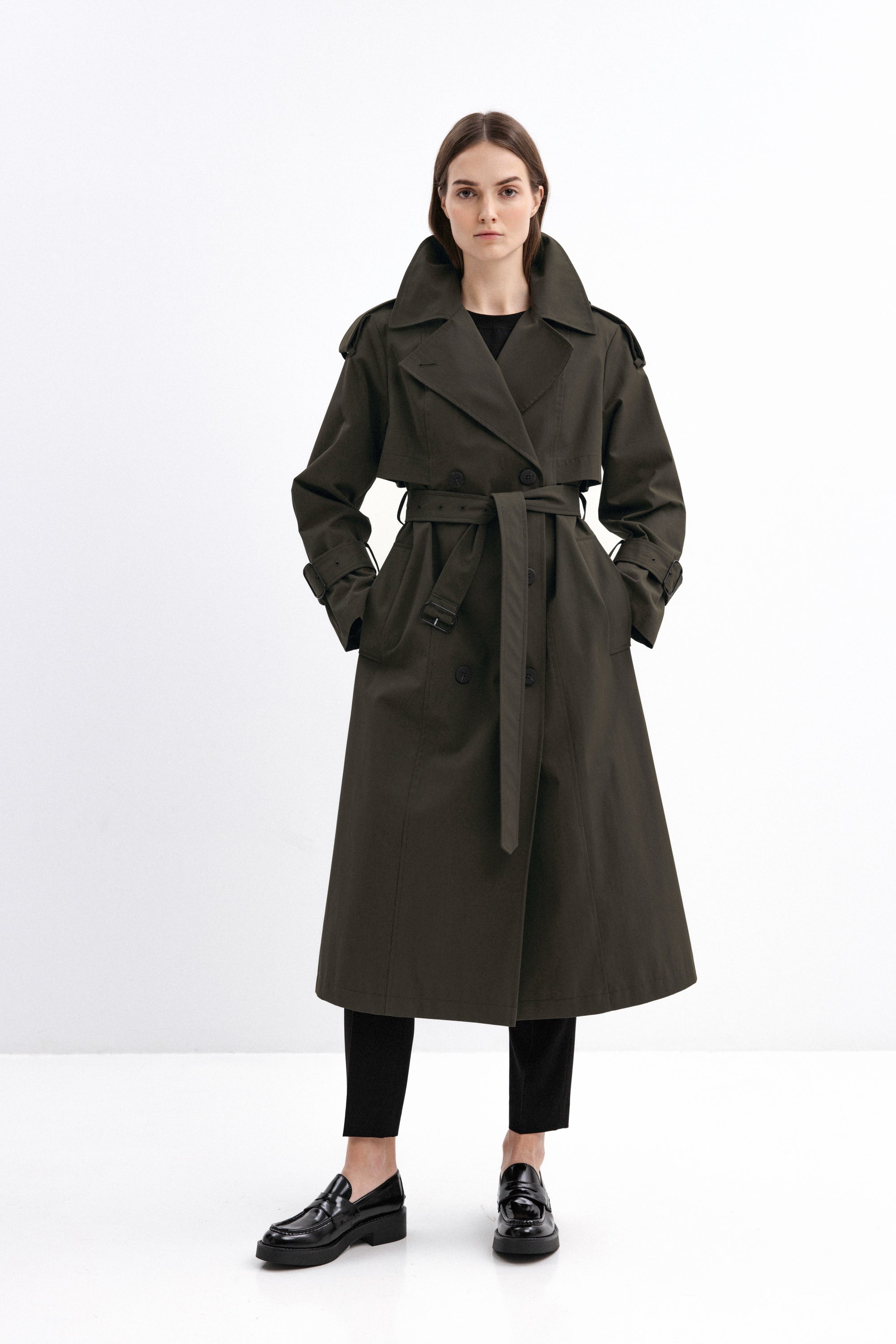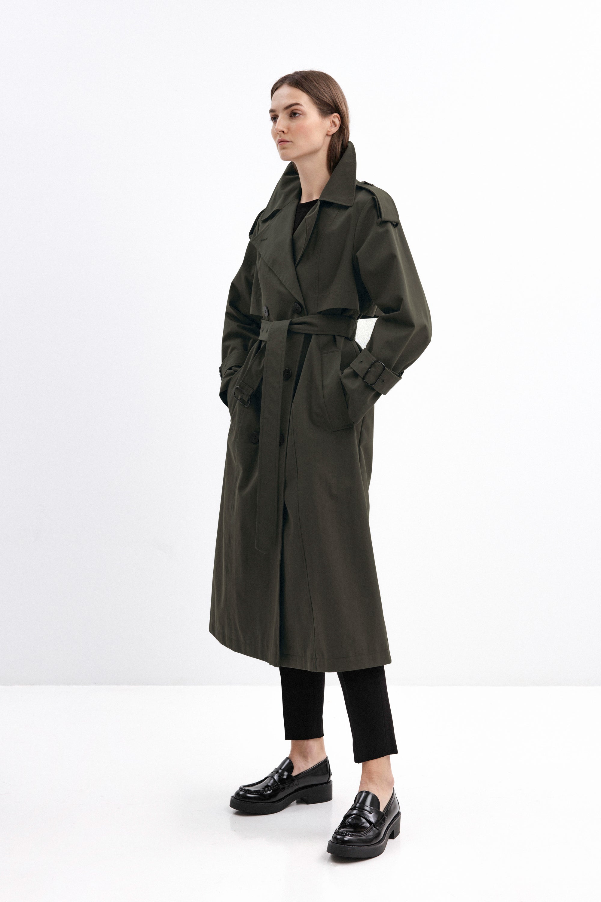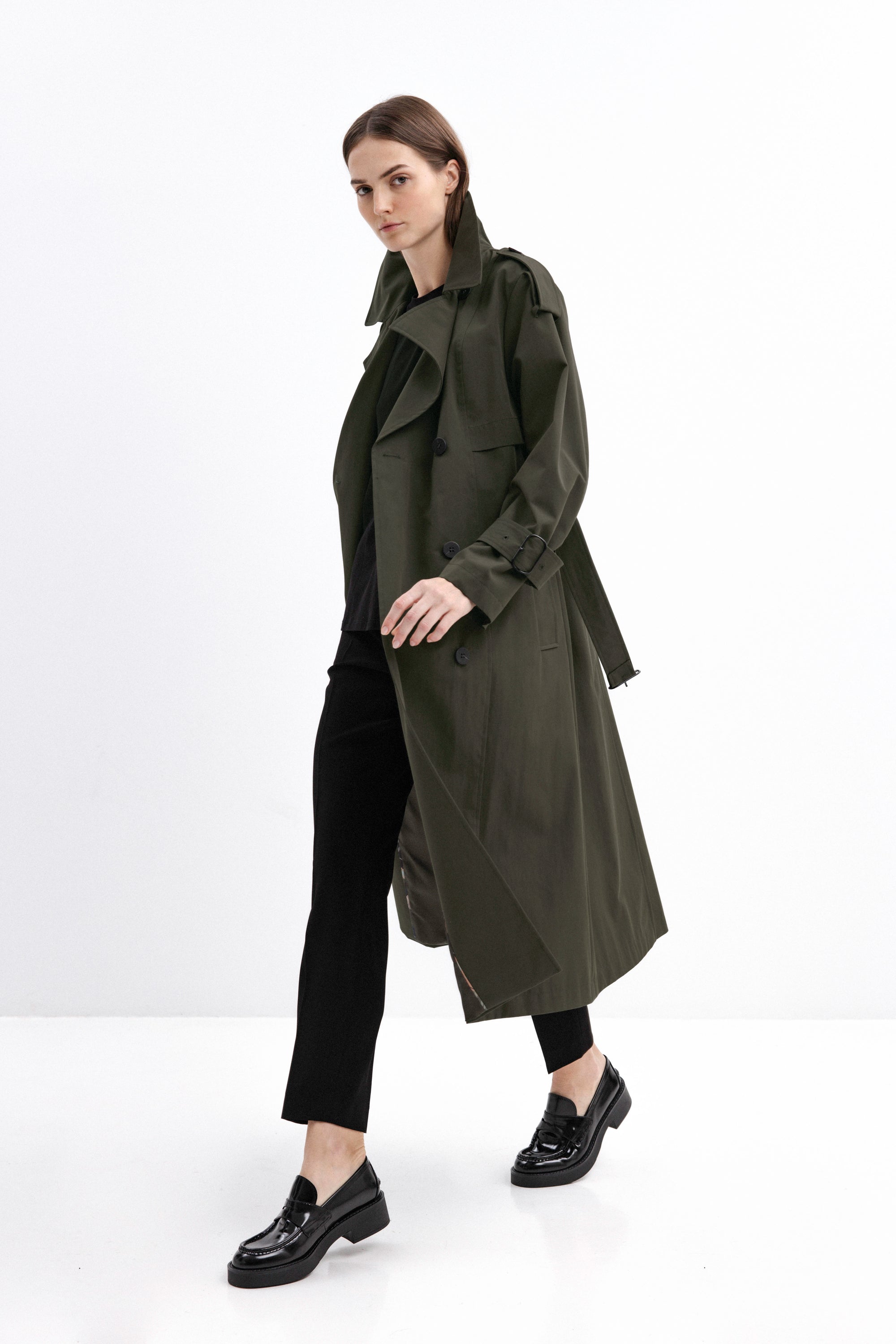 DOUBLE-BREASTED TRENCH COAT IN OLIVE