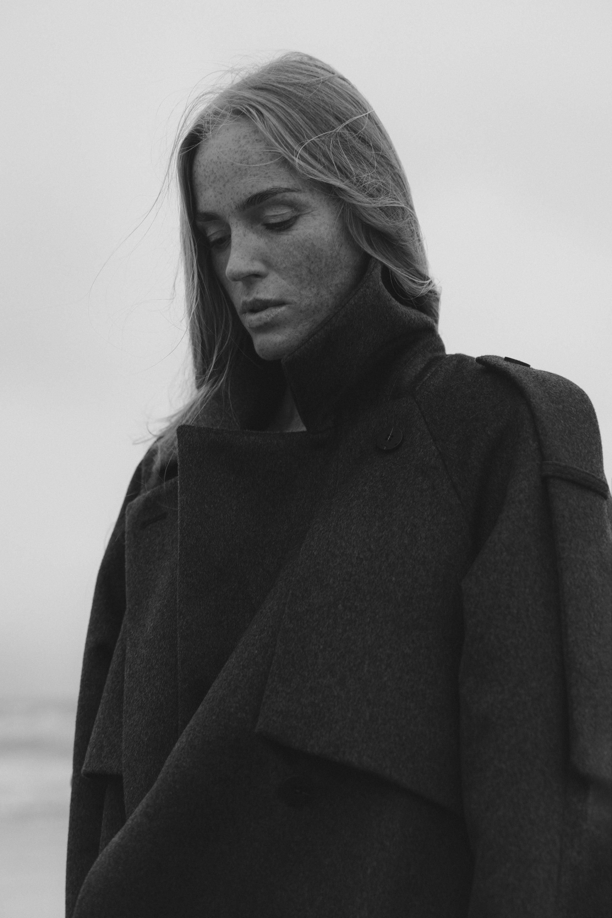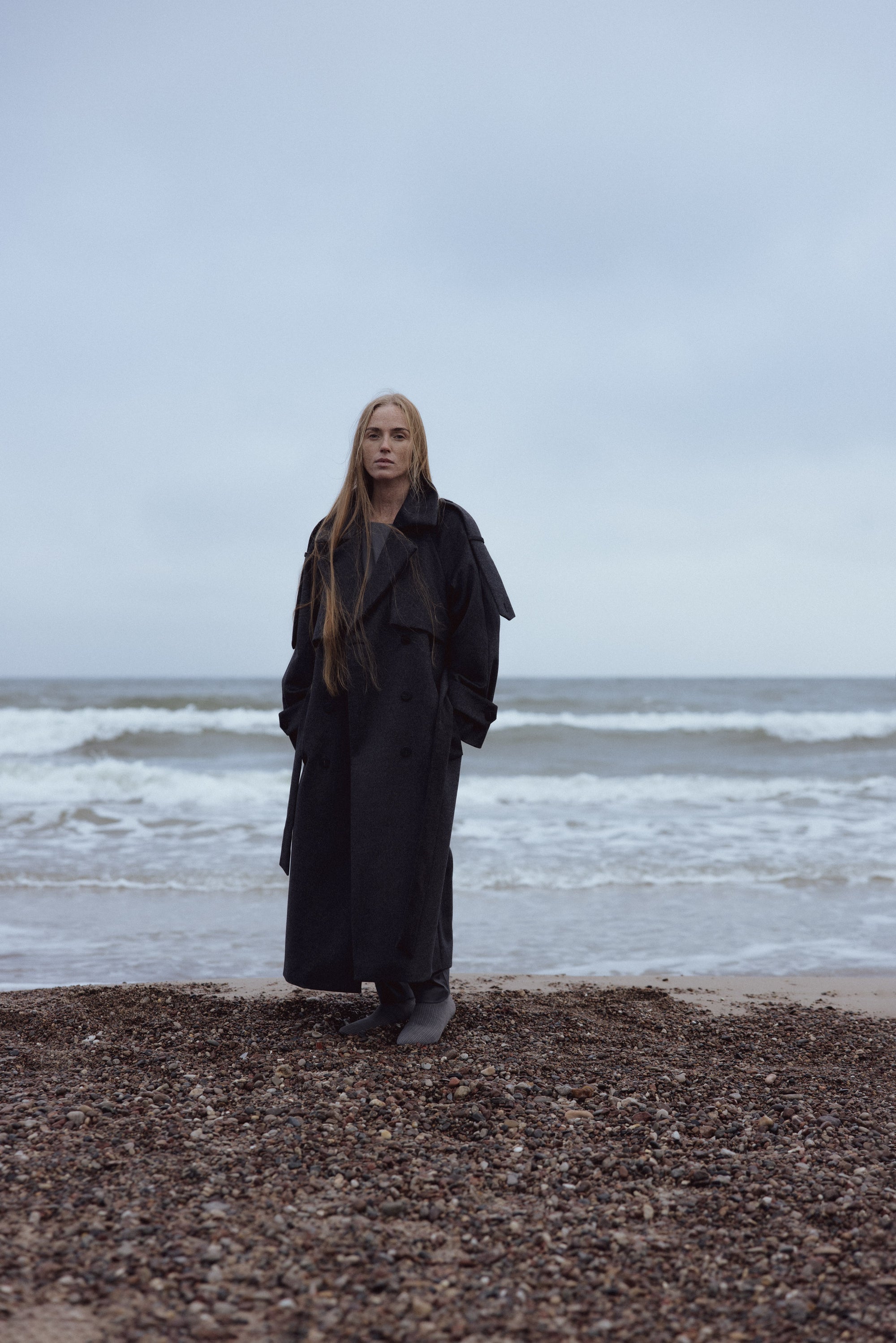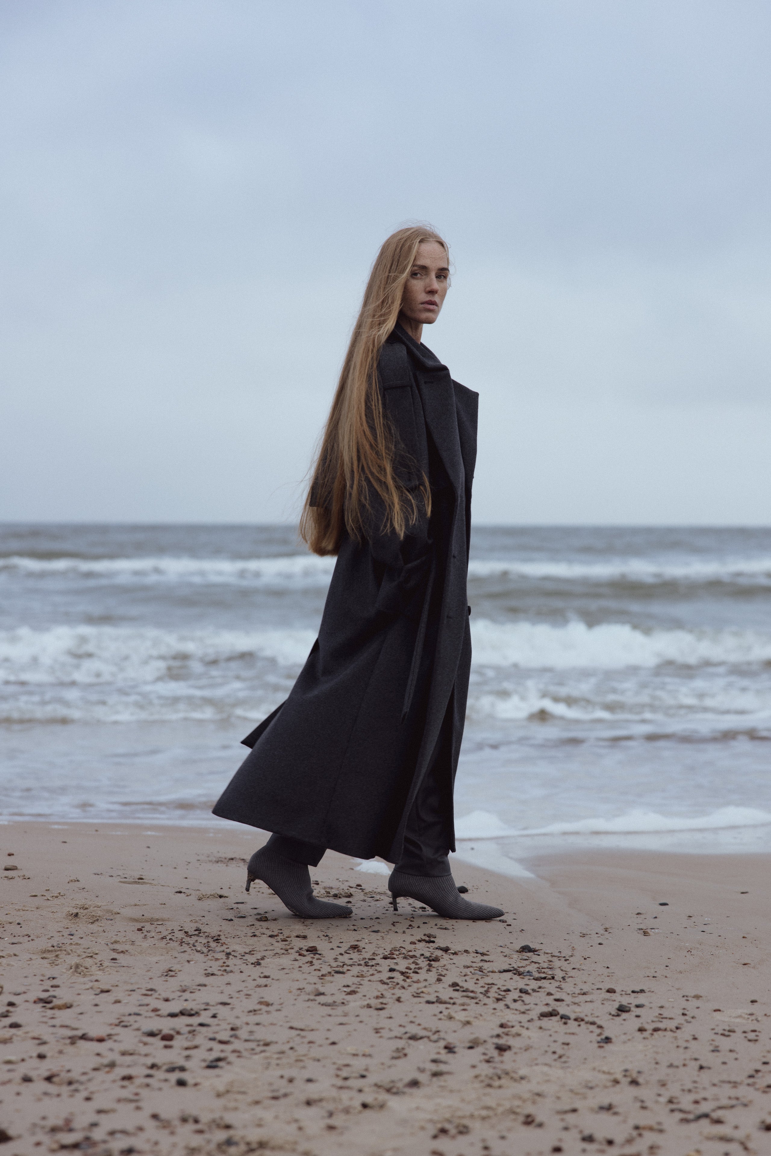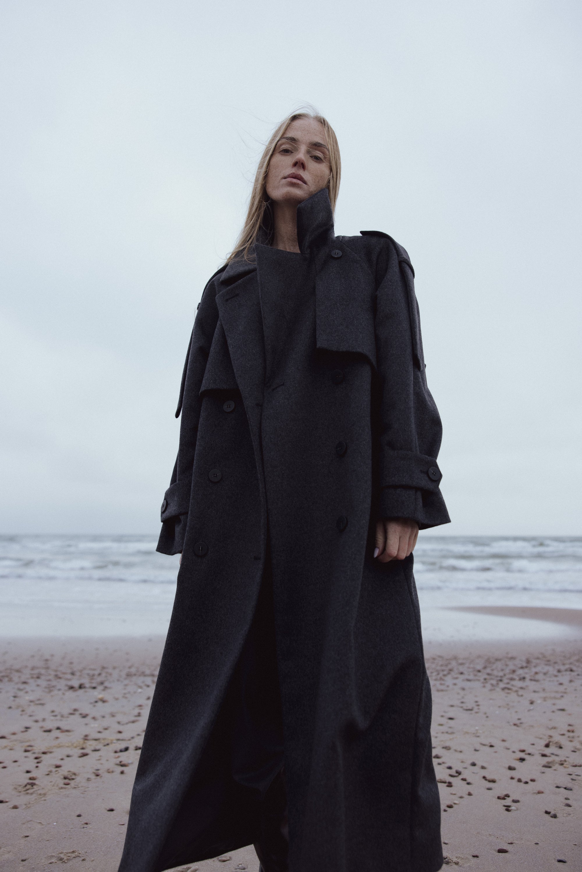 One of the capsule’s signature pieces is the long double-breasted coat, distinguished by sculptural lapels and a wide waist belt. Its structure, inspired by the city’s skyscrapers, reflects vertical lines and architectural precision. A cinched waist, refined shoulder accents, and meticulous detailing convey strength and confidence, while its functionality ensures warmth, comfort, and effortless movement – making it an essential companion for urban life.