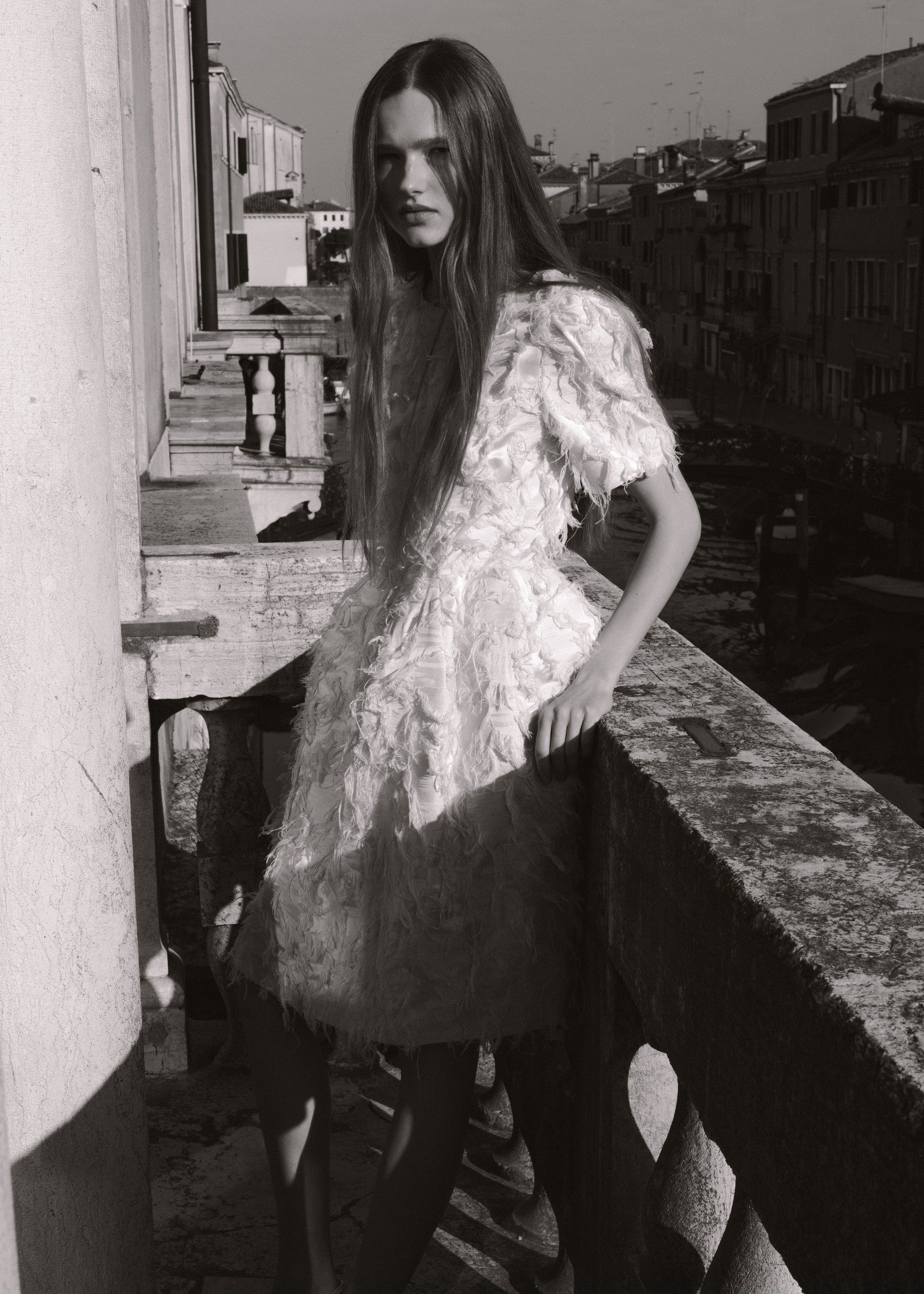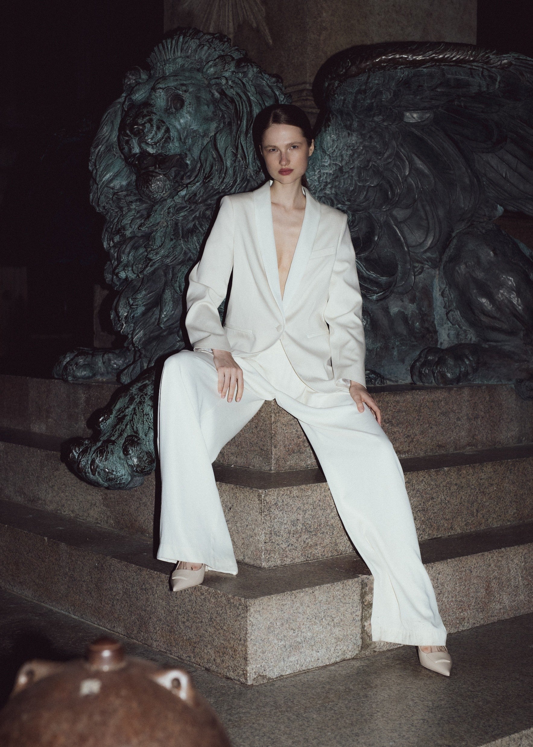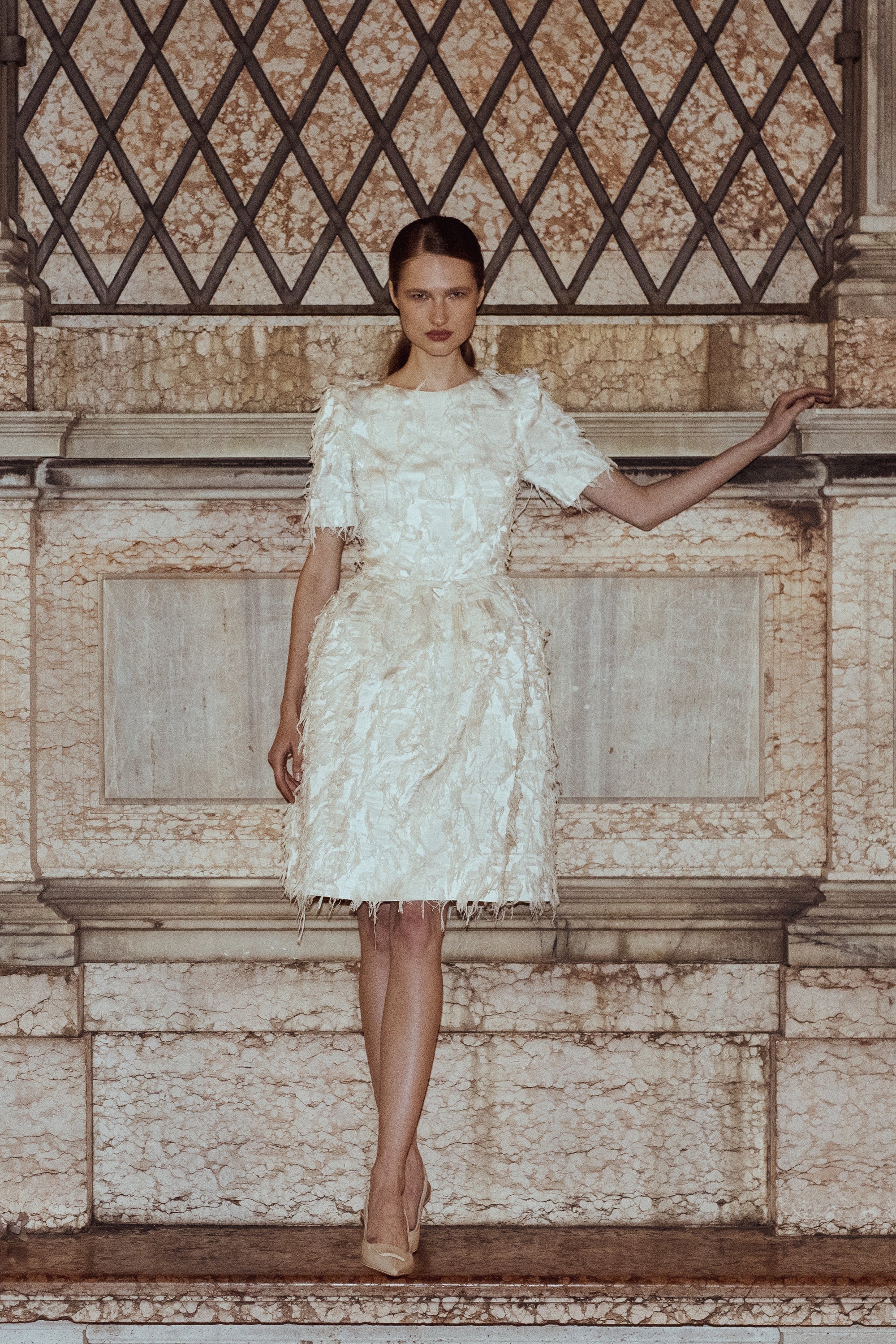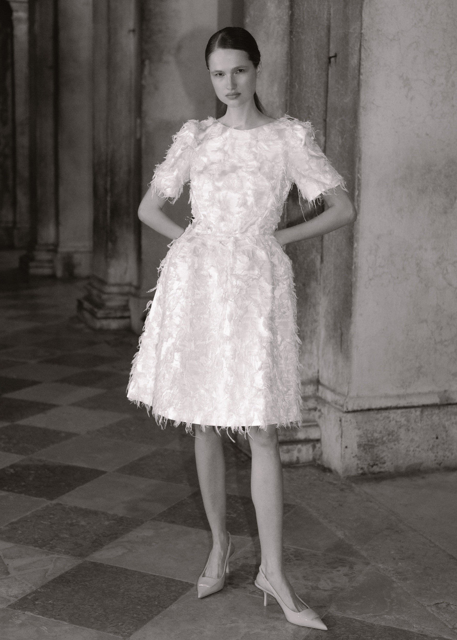 A signature piece of the collection, this milk-hued dress captures the essence of Sublime Serenity through its intricate frayed jacquard—threads softly pulled to create a texture that feels both raw and refined. It’s a study in contrasts: delicate yet structured, understated yet deeply expressive.
